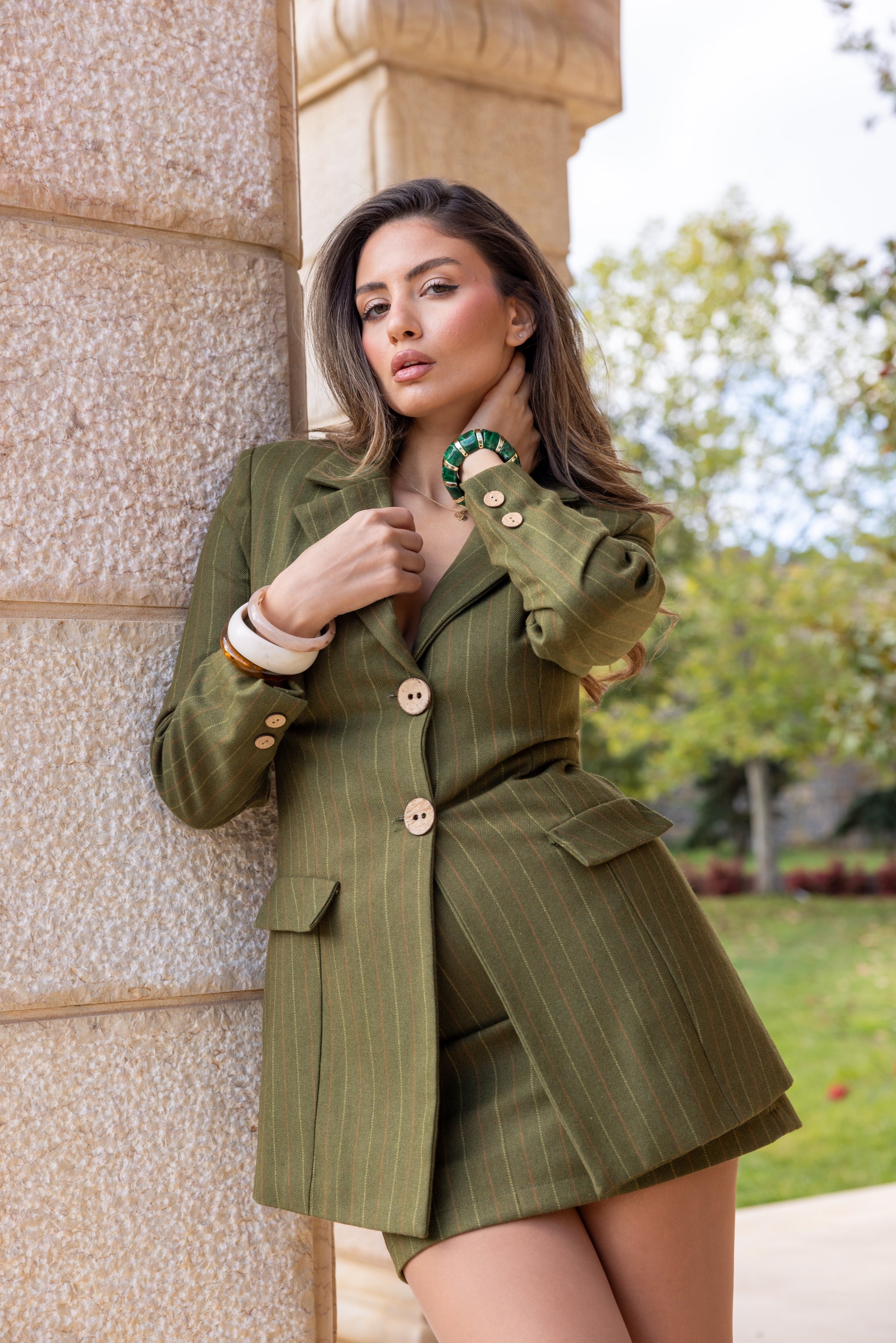 A refined wool ensemble in a rich olive green hue, featuring subtle stripes for added texture. The set includes a tailored skirt and a fitted blazer, finished with statement wooden buttons that bring warmth and character to the look.
